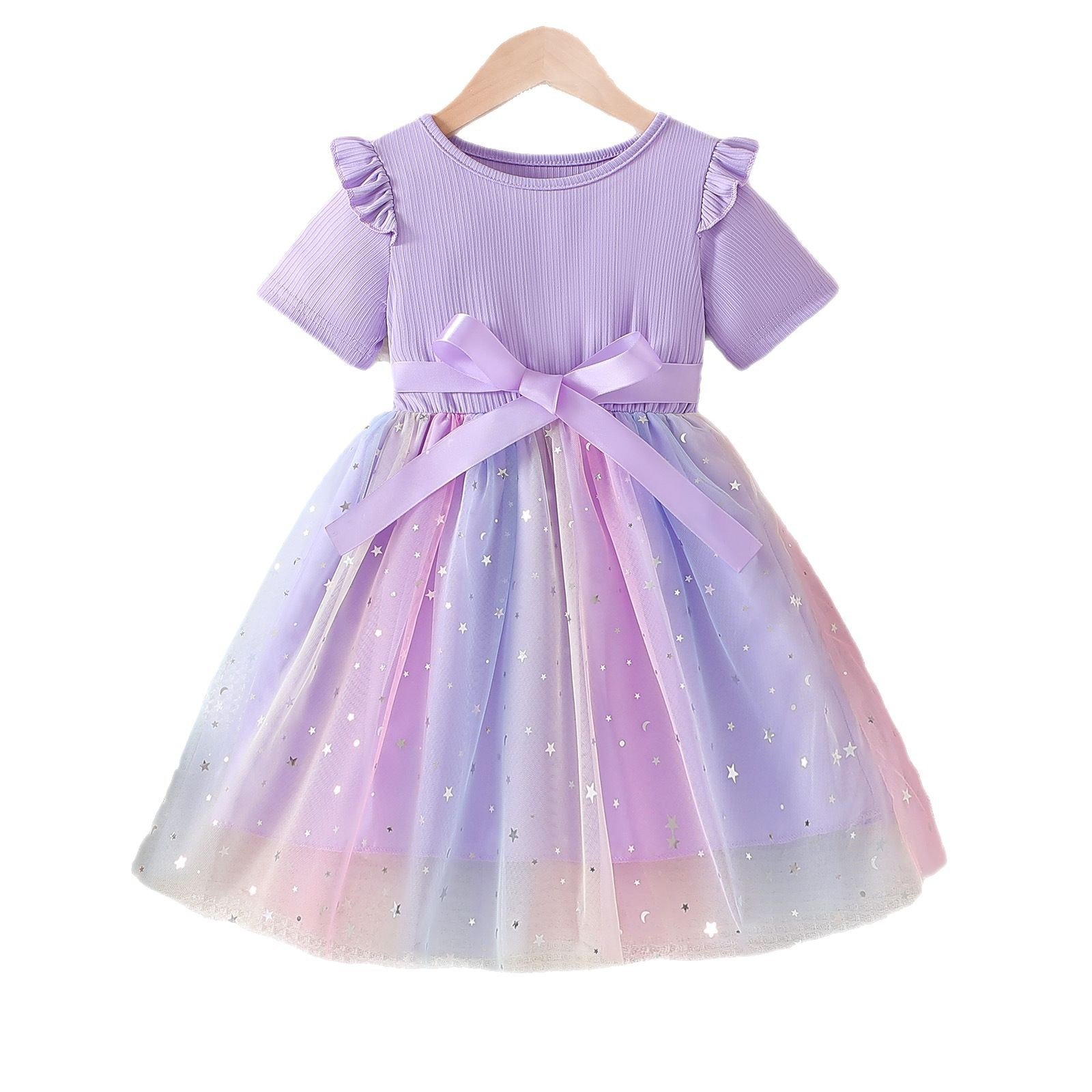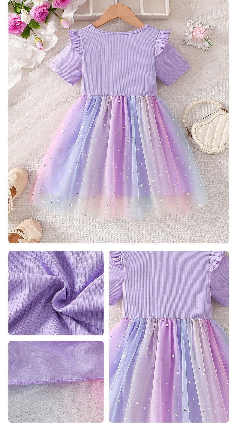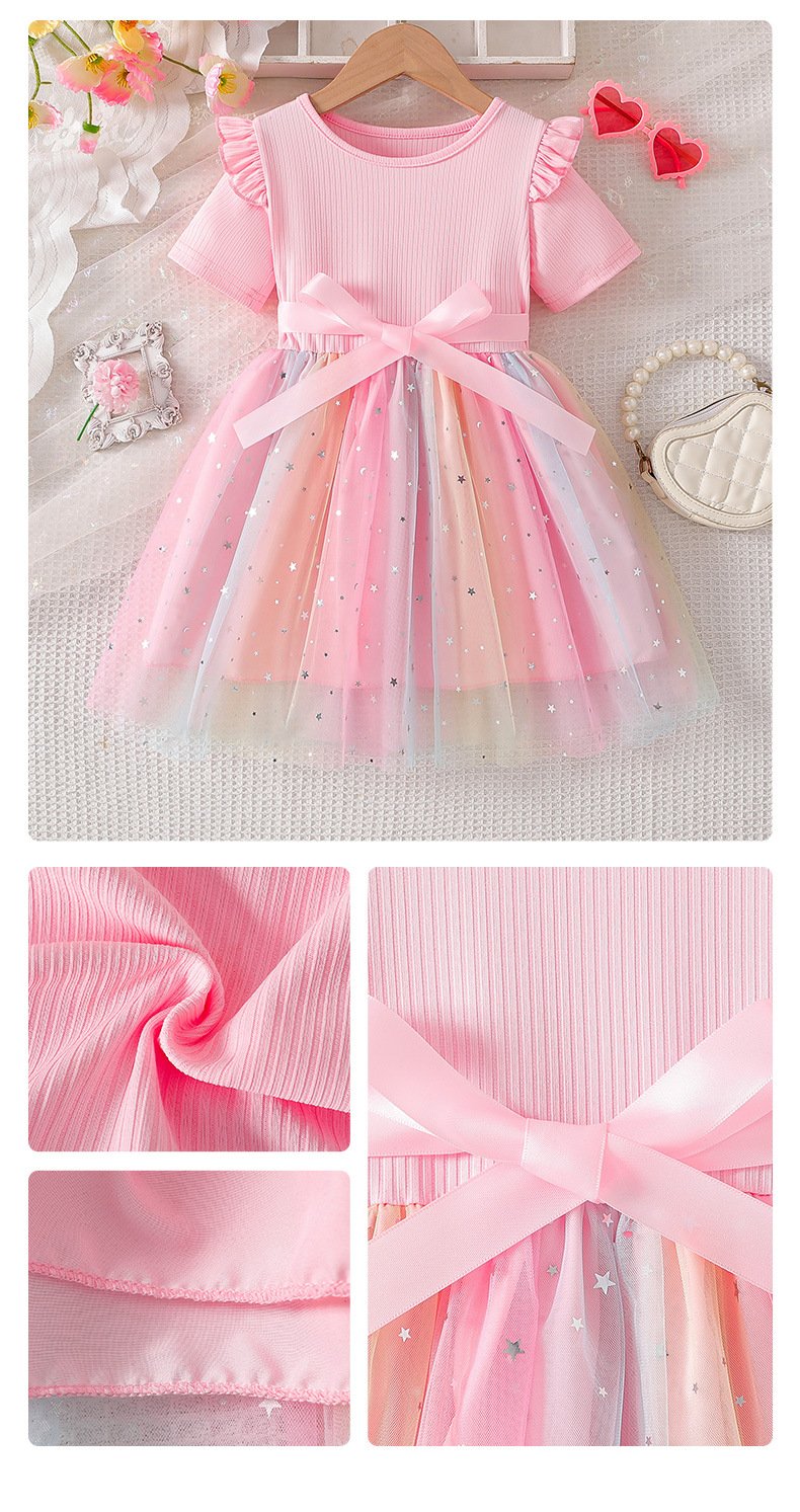 Girls Bow dress 2025 Summer Short-sleeved New Girls Gradient Mesh Children’s Princess Dress Trendy